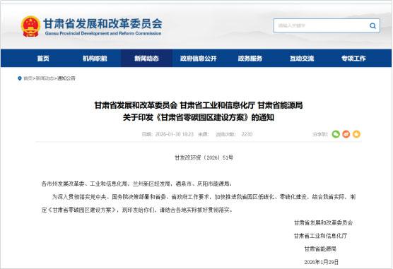 2026年1月30日,甘肃省发展和改革委员会、甘肃省工业和信息化厅、甘肃省能源局发布关于印发《甘肃省零碳园区建设方案》的通知(甘发改环资〔2026〕51号)。