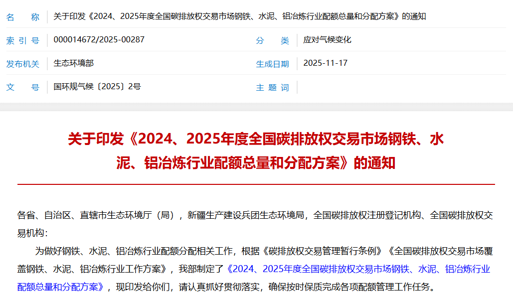 为加快建成更加有效、更有活力、更具国际影响力的碳市场,助力实现碳达峰碳中和目标,生态环境部于近日出台《2024、2025年度全国碳排放权交易市场钢铁、水泥、铝冶炼行业配额总量和分配方案》,对2024、2025年度配额分配范围和方法、配额发放、配额清缴、配额结转等各项工作进行了安排部署。